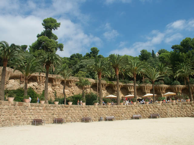 A row of palm trees lines a rocky Gaudi wall and provides shade to a cafe terrace below.