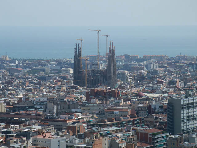 A hazy/smoggy La Sagrada Familia towers over the city in the distance, seen from Parc Guell.