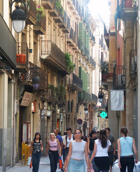 A typical street (although some are half the width) in Barcelona's old town - Barri G̣tic. It's a maze of dark streets crammed with cafes, bars and medieval buildings. And often somebody's laundry, strung out between buildings high overhead.