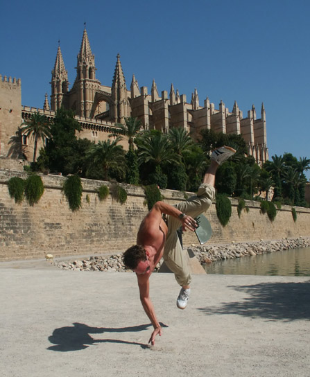 After having previously mastered breakdancing earlier in the week, I have now taken up the ancient art of Capoeira, the Brazilian fighting dance. Here, Palma's huge gothic church provides a scenic backdrop for practising the one-finger-stand-and-twist (an original move).