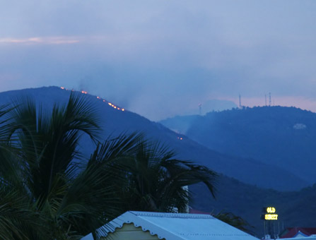 A bush fire we spotted while in Phillipsburg, burning on an uninhabited hill on the French side. It's been really really hot and dry lately.