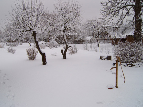 A photo of the back yard here, taken back in January, when the average temp. is -9 to -15ºC. In July it's 16-20ºC (although it was 25 a few days ago). The coldest temp. recorded in Estonia is -43ºC. (if you don't know Celsius, tough... go metric - it's the future!) Thank God I arrived in Spring! (although it means that the fast-growing grass provides me with many hours of lawn-mowing time each week!)