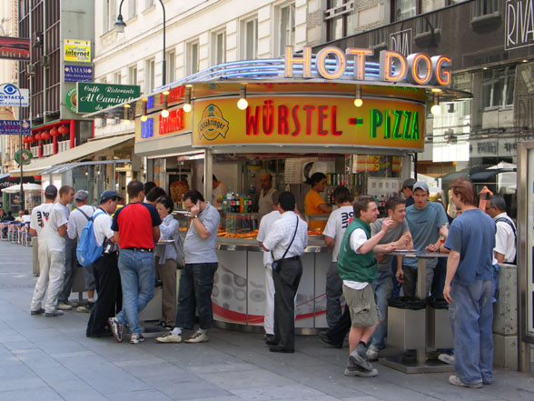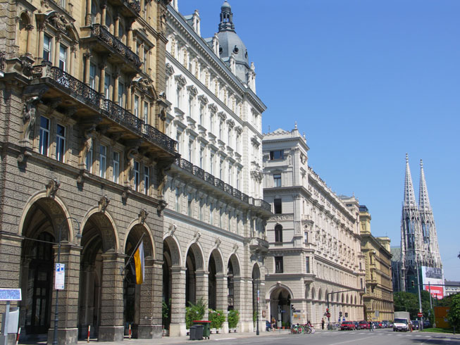 The following day we wandered around the city - one of the prettiest we had visited so far. Wide boulevards, statues, imposing old public buildings - Vienna felt very grandiose, and very old (in fact it became a city in 1137). Later I bought some Austrian-made alcohol - rum, and of course, peach schnapps (ugh!) - and back at the hotel we began a fairly rioteous night of food and drink (although Mum, sensibly, was sticking to apple juice). We then ventured out into the city, and ended up at Rathaus Platz (townhall square), where a huge crowd was celebrating Vienna's biggest open-air film festival - the annual Music Film Festival. A large screen had been erected on the side of the town hall, and an opera film (oh joy!) was playing to almost nobody. The buzzing crowd was concentrated around the food and alcohol tents (surprise surprise). We sampled more Austrian beer, and some very un-Austrian Indian food, which was tasty at the time, but very un-agreeable the next morning. Later we sat in the sea of folding wooden chairs erected beneath the screen, and watched some of the film. Although I hate opera, it was a good feeling just sitting there before this magnificent building, under a cloudless, starry sky, in a beautiful cultured city, getting my well-needed dose of culture. Maybe the alcohol was helping along the warm-fuzzy feeling, but still, it was a good night!