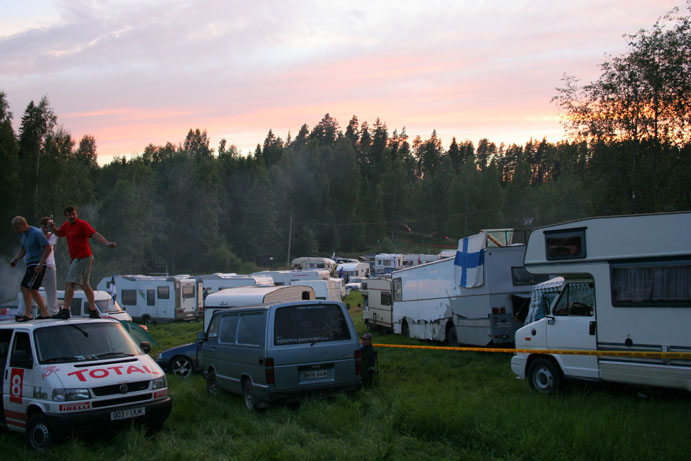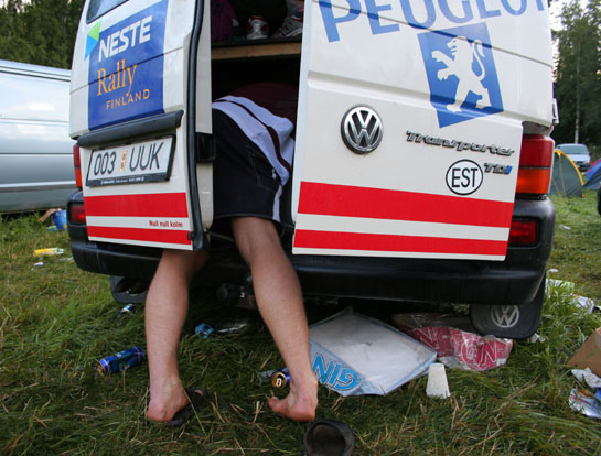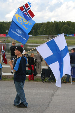The student city of Jyvaskylä (300km north-west of Helsinki) has a population of around 90,000 - but over the three days the rally took place, another 200-300,000 people flooded the city. This made it pretty tough finding a good spot beside the road to watch the cars fly by. People everywhere. But everybody was in a great mood (helped along by copious amounts of alcohol) and there were national flags aplenty.