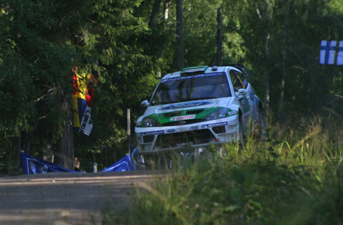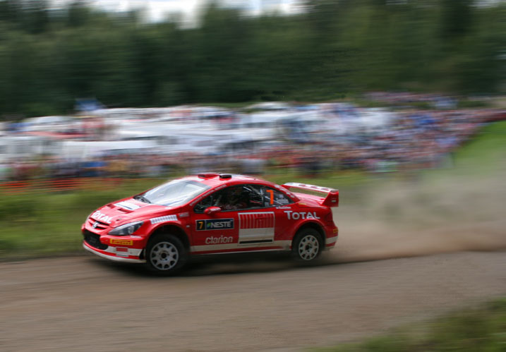 The Finnish driver Marcus Gronholm flies past in his Peugeot 307 WRC car. Coming second in the championships overall, he went on to win the rally of Finland. He knows those roads better than he knows his own wife.