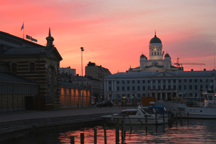 The sun sets over the Cathedral in Senate Square, Helsinki.