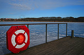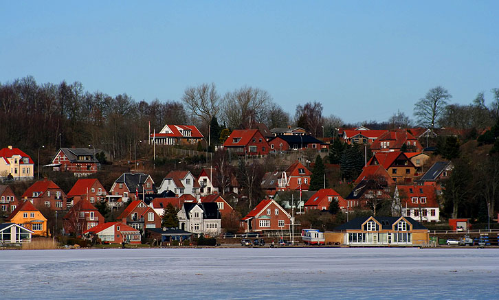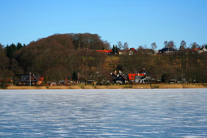 Looking out across the frozen lake surface at the typical Danish houses lining the shore...
