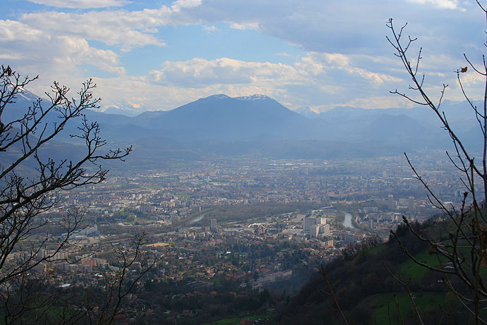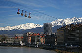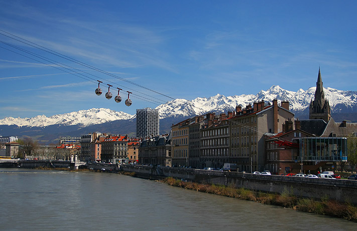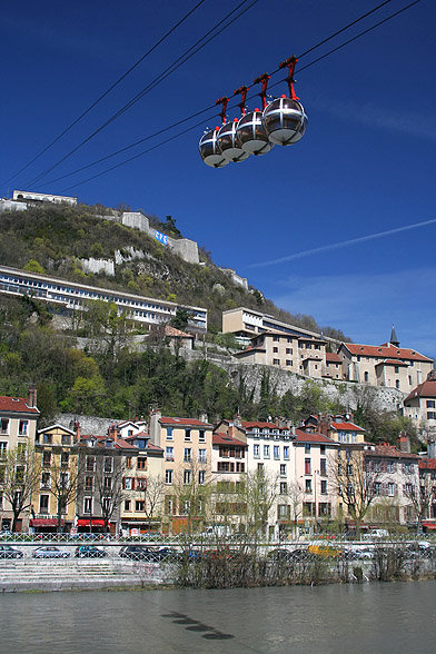 The postcard shot of Grenoble, which you'll find in most tourist stores here. Those little bubble-things are the gondolas that take tourists across the Isere River from the central-city and up to La Bastille.