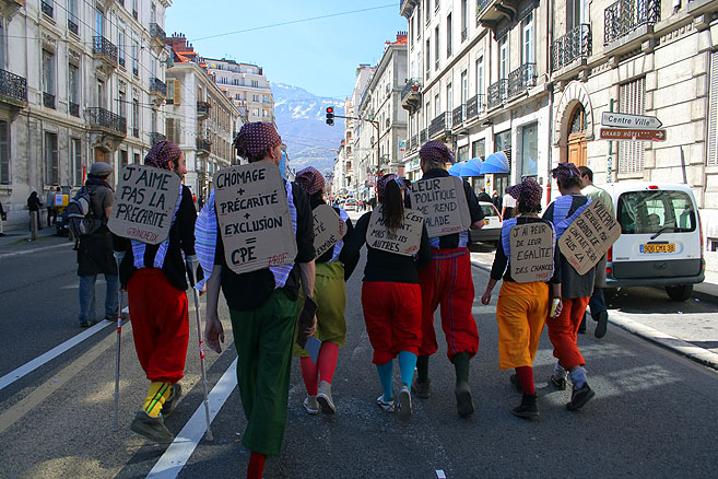 Some protesters walking through the streets, dressed as clowns and with various signs attached to their backs.