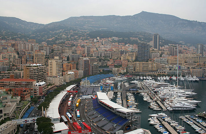 Monte Carlo, the capital and only city of the The Principality of Monaco. The Monaco GP (Formula 1) was about to begin around the time I took this photo - notice the track-side seating, centre-bottom.