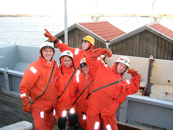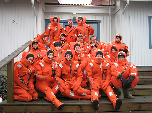 The whole group of us (including Kiwis, Aussies, Brits, Germans and Swedes) in our cold water survival suits, just before jumping into the bone-chilling water.