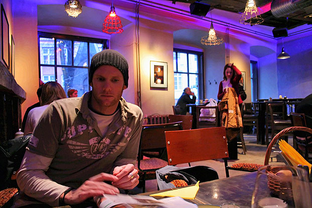 After braving the horrid weather yesterday, we had a great lunch in the old town. Here's me trying to decipher a local newspaper while we waited for our food. I'm gonna miss the prices of Estonia!
