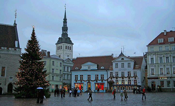The Christmas tree in Raekoja Plats, on a gloomy day in Tallinn's city center. It's home to the only surviving Gothic town hall in northern Europe, built in the 14th century.