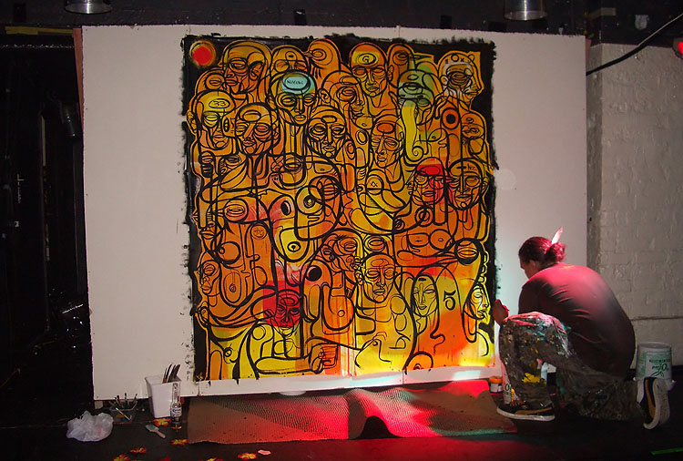 The completed work of New York street graffiti artist Doze Green, at a club in Auckland the other night. Pretty cool, but the night started off in a rather spectacular way... a ceiling fan fell onto a guy in the crowd. Everybody was flapping around panicking and doing nothing, so I called an ambulance, helped tend to his face (which was slashed open from the top of his right eye, across his nose, and down his left cheek), walked him outside through the crowd (the place was jam-packed), and waited for the ambulance with him, wondering when shock was going to set in. Helluva way to start off my night. The guy was lucky really though - he could've lost an eye, or worse.