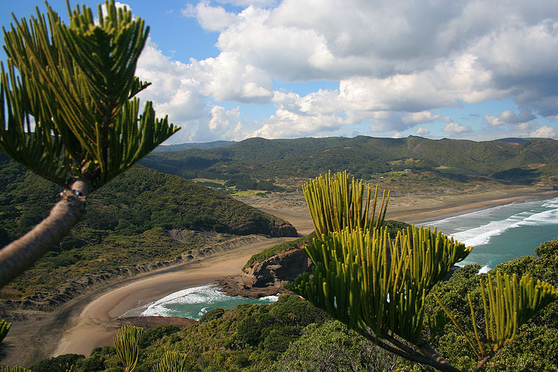 We climbed a hill overlooking Bethell's Beach (near Brett's house) and climbed the tree on the highest point. This is the view that greeted us.