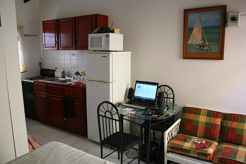Half of my apartment on the beach... this is what US$700 a month in the Caribbean can get you. My little beach box. But at least it's got WIFI. A geek needs his Internet.