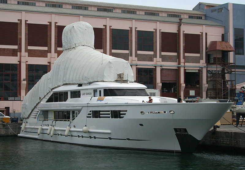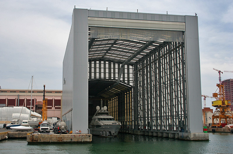 A megayacht is dwarfed by a boatshed, inside the boatyard we're currently docked in.