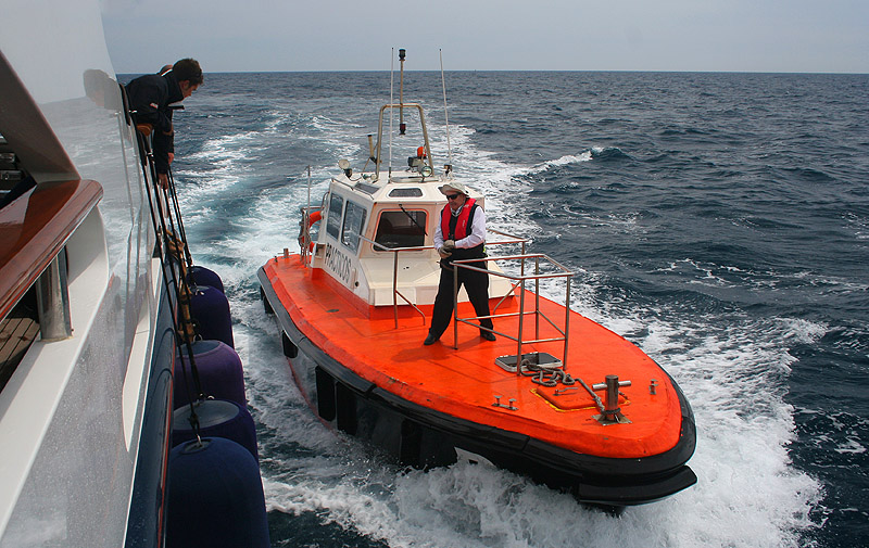 The pilot boat arriving alongside us just before we entered Barcelona's port. Some of the world's ports require a local 'Pilot' with knowledge of the shipping lanes etc be on-board during entry to the port.