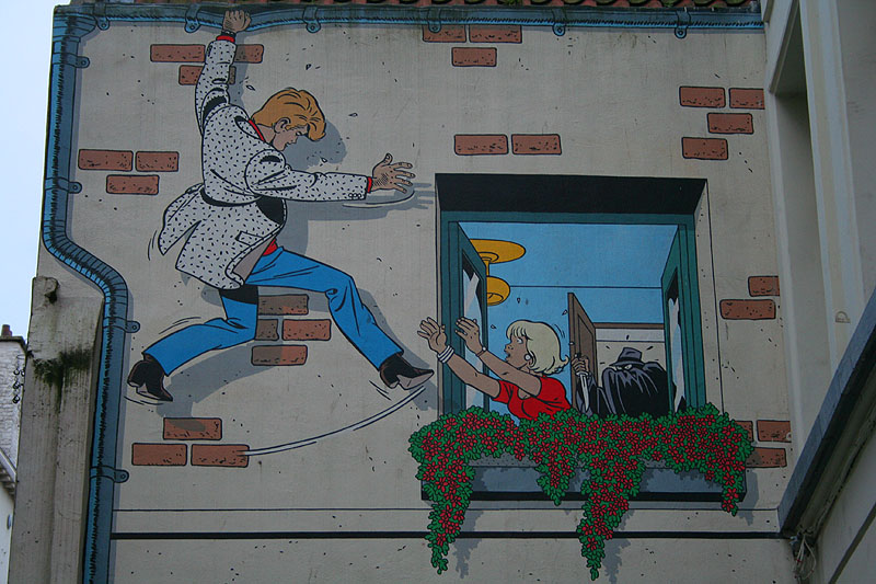 Wall art in central Brussels, in the same vein as Belgium's famous Tin Tin cartoon.