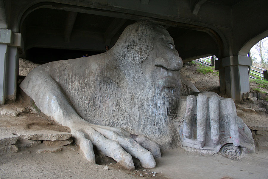 The Fremont Troll, in Seattle. That's a real Volkswagen Beetle he's holding... It was built to replace the ever-increasing gathering of local drug dealers under the bridge.