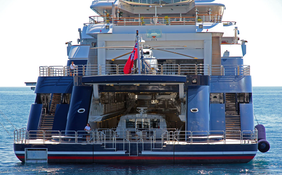 That's a 19m (63ft) tender, docked inside. The aft section of Octopus drops down, and they simply drive the smaller boat in.