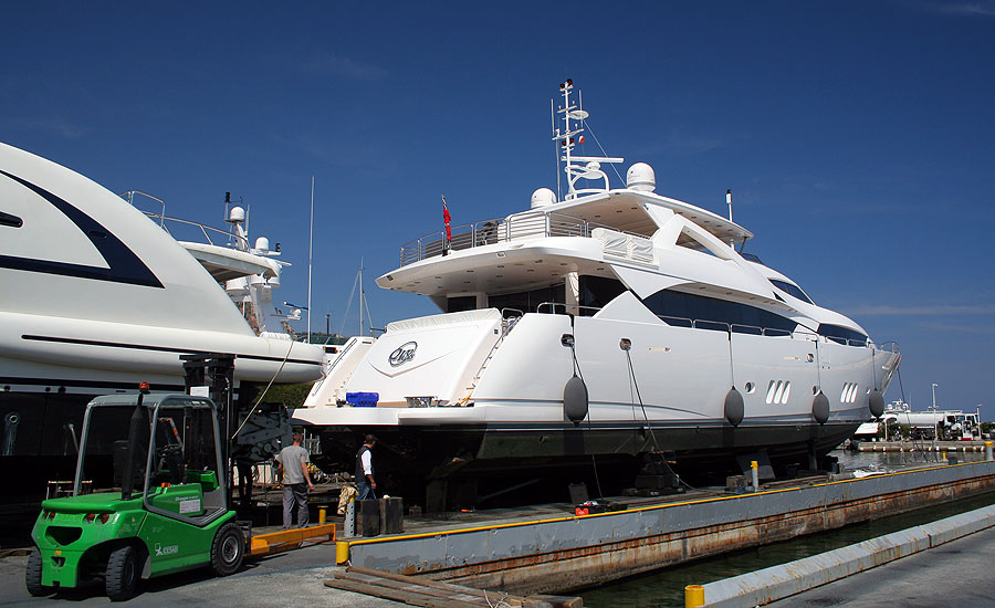 The boat in the yard a month ago, getting the antifouling re-sprayed, props cleaned etc.