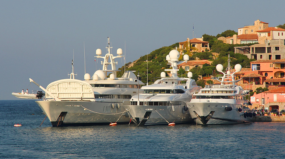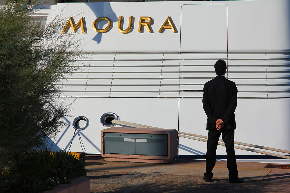 Us, tied up in Porto Cervo (Sardinia), behind M/Y (Motor Yacht) Lady Moura. Owned by a Saudi mult-billionaire businessman, she is 105m long, making her the world's 19th largest superyacht... and making us look ridiculously small! The names on the sides and stern are carved in 24-carat gold.