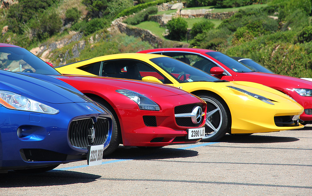 Porto Cervo is all about the Who's Who. The Prada set. These supercars are lined up outside a yacht. The owner can walk outside and take his pick. I can't stand the plastic nature of Porto Cervo. There's nothing to do there but show off your yacht or Lamborghini or trophy wife or gold-digger fake-tan 6-foot girlfriend, prance around in your Gucci loafers while puffing on a Cuban and think to yourself just how rich and successful and admired you are. Ugh.