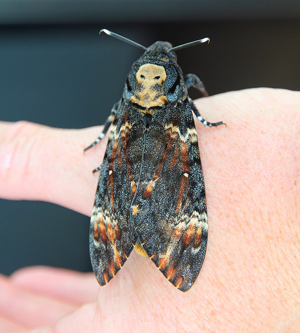 A huge moth that hitched a ride with us for a while. It had some real weight to it when I picked it up, and made a loud clicking squeaking noise when I tried to put it down. I love the alien skull design on his head.