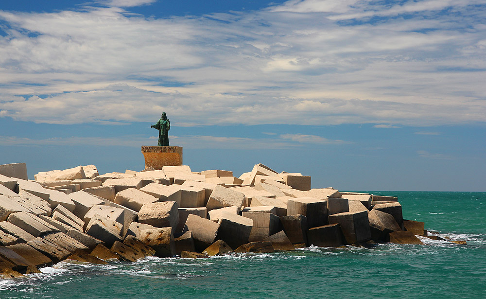 The concrete blocks forming a man-made sea-wall at the entrance to a small Italian port.