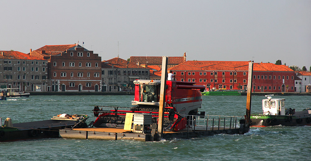 A combine harvester floats by the boat. Of course.