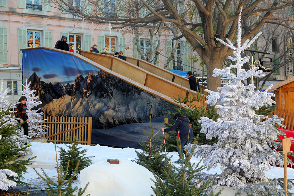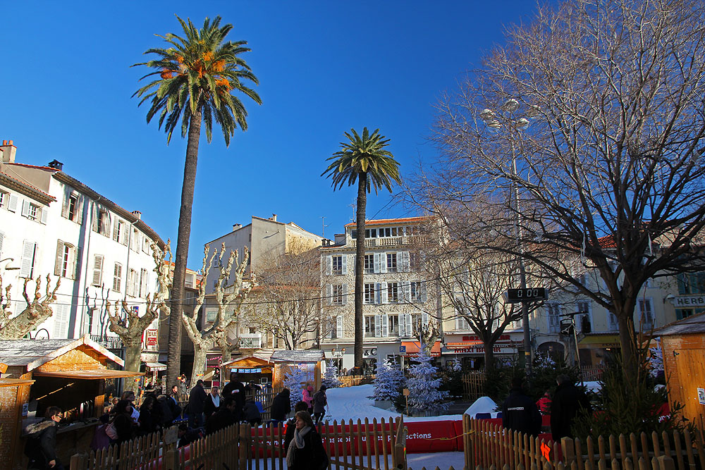 Place Nationale, and the weird juxtaposition of palm trees and snow (albiet fake snow).