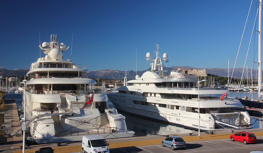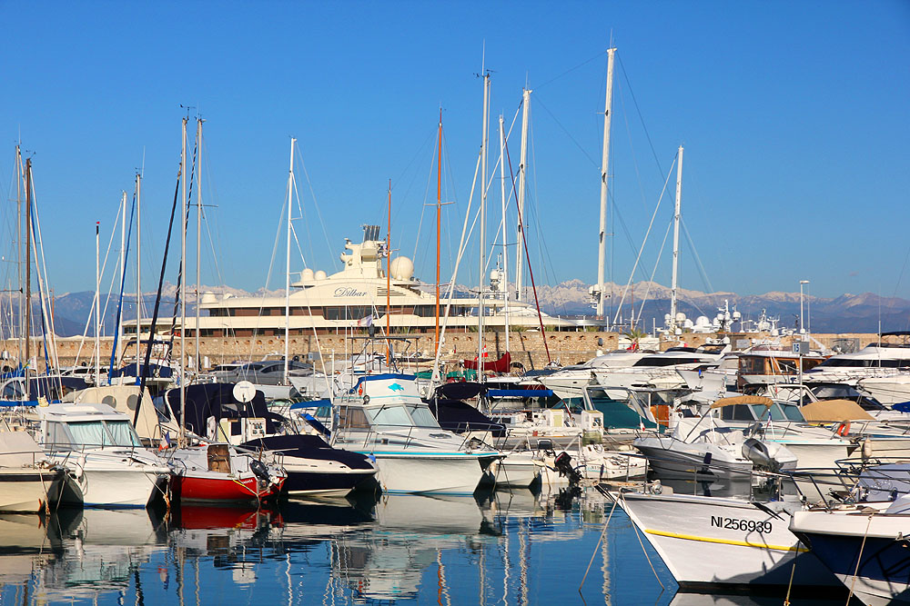 The 110m-long Dilbar tied up in the IYCA marina of Antibes, and the Alps in the background.