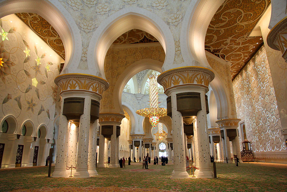 The mosque contains the world's largest single carpet, and the world's largest chandelier.