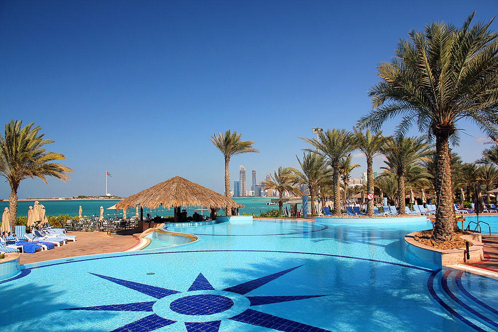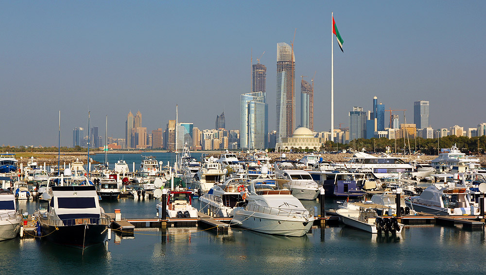The Abu Dhabi skyline, including the once tallest flagpole in the world (122m) (now claimed by the 160m pole in North Korea).