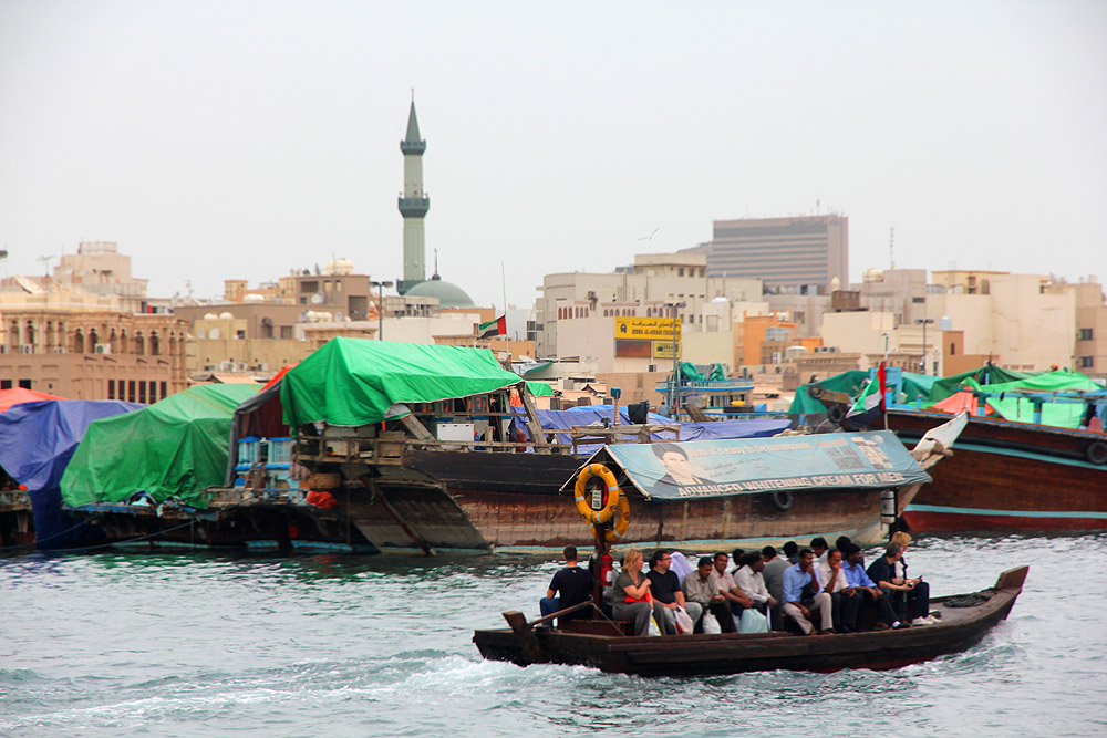 A water taxi on Dubai Creek. (The advertising on its roof is for 'Fair and Handsome' - advanced whitening cream for men. "Now it's easy to be handsome". Ooookay.)
