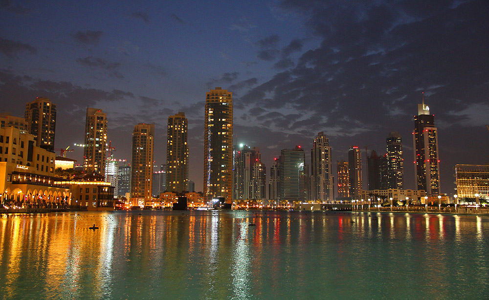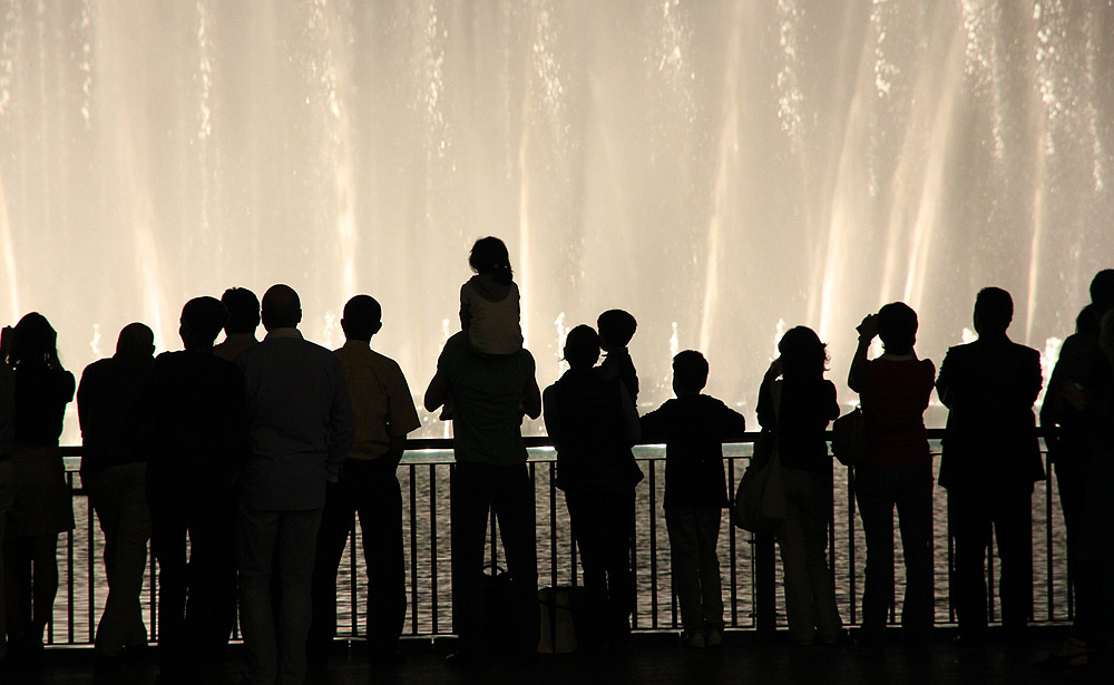 Onlookers watch the Dubai Fountain perform one of its regular displays. Very similar to the Bellagio fountain in Vegas.