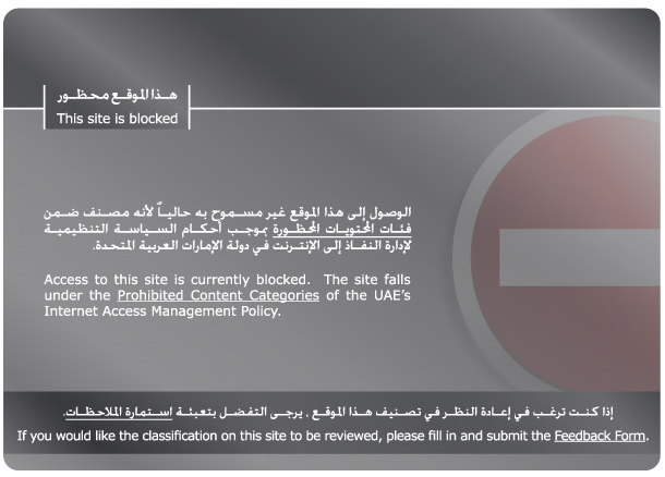 Emirates censorship. This is the image that greeted me when I tried to view my web site whilst in the UAE. The UAE bans "pornography, politically sensitive material, all Israeli domains, and anything against the perceived moral values of the UAE." I guess my site somehow goes against the morals of the Emirates? Damn. All or most VoIP services (such as Skype) are also blocked.