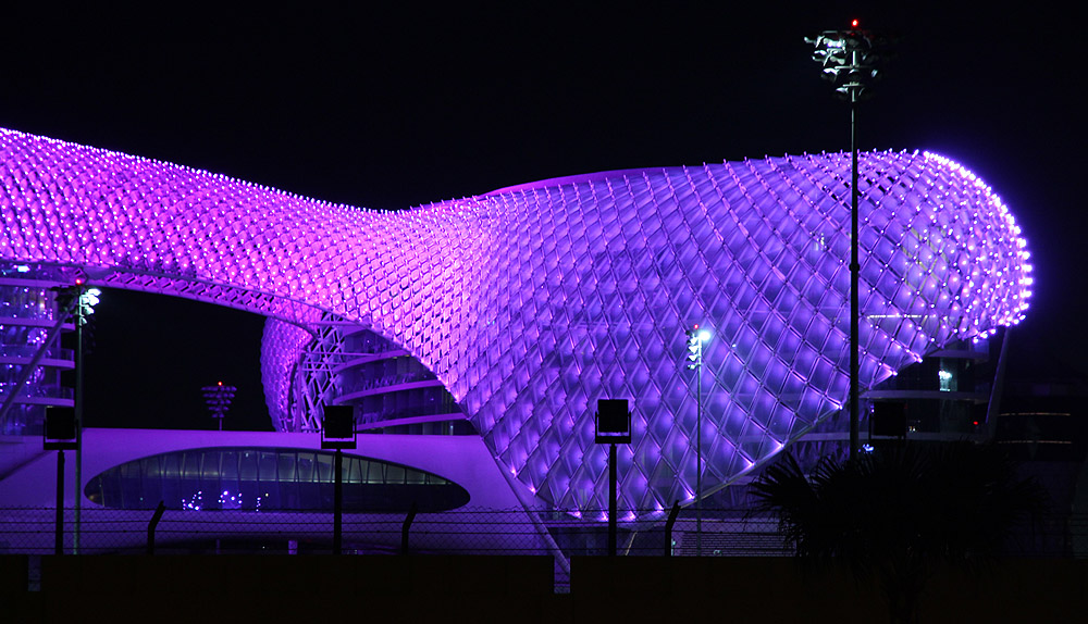 The colour-changing Yas Marina Hotel, on Abu Dhabi's Formula-1 circuit on Yas Island. (Oh and yes, yet another record - the first hotel to be built over an F1 circuit.)