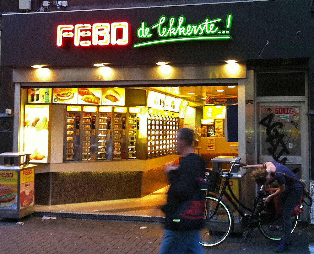 A Febo 'restaurant'. Founded in 1941, they're the quintessential Dutch automatic food vendor, selling things like frikandellen and bitterballen from behind those little window flaps. Instant deep-fried gratification.