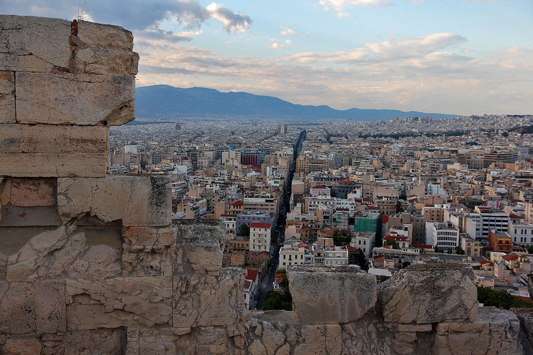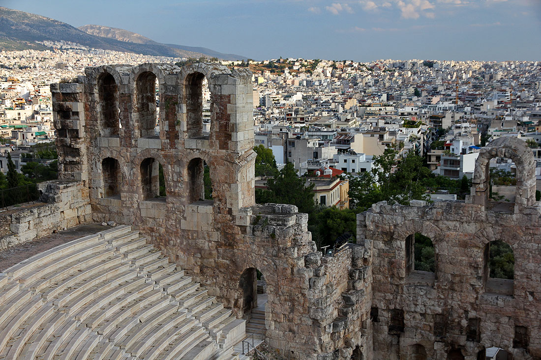 Looking past the Theatre of Dionysus towards the sprawling Athens suburbs.