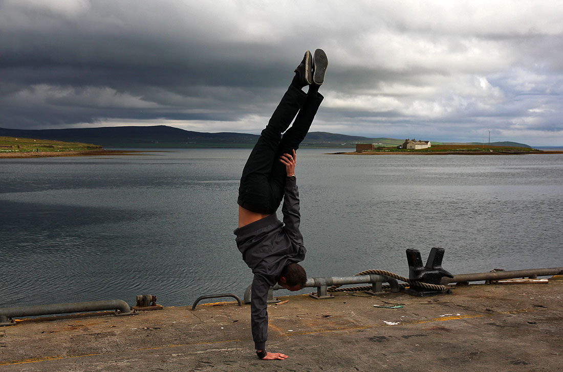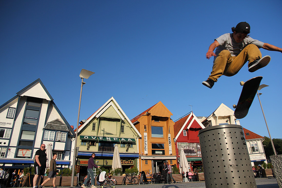 A skater attempting a jump (many, many times, until he got it right) in Stavanger, Norway. He turned out to be a kiwi.
