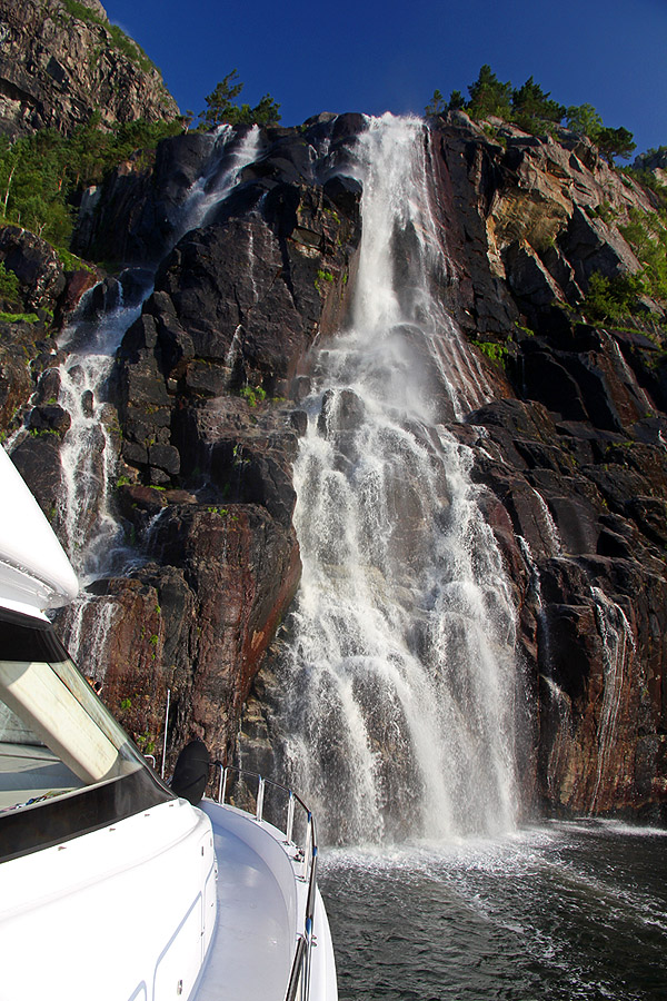 Getting up close and personal with one of the many waterfalls in the fjord.