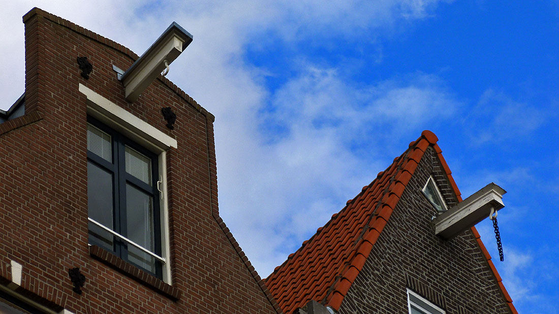 Hooks on the roofs of Dutch buildings are a common sight. There used to be a tax levied on the width of your building (the street frontage), so to minimise their taxes, people started erecting tall, skinny houses. The problem was, they couldn't get their furniture up the pokey staircases. Hence the hooks - to haul their furniture up the outside of the house. (The buildings are often built leaning outwards slightly too, so that the couch doesn't bang the windows on the way up).