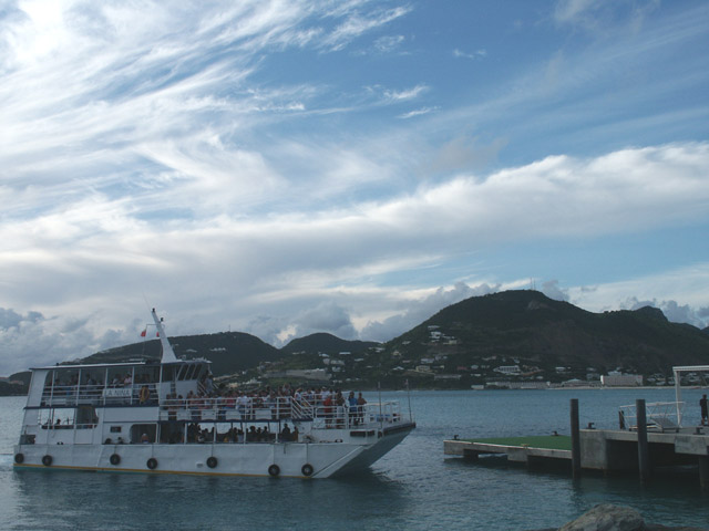 La Nina, the boat I work on, as she pulls in to the cruise ship pier to drop off the guests. She used to be a World War II beach landing boat - the whole bow section opens down to allow the soldiers onto the beach (or in our case, the snorkelers into the water). We (Charles and I) operate Snuba diving from the rear lower deck, sliding into the water over either side.