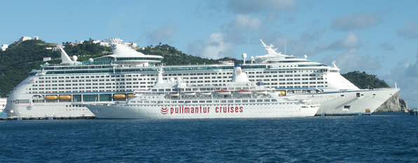 The little one in the front of the big Royal Caribbean ship is actually the original Love Boat. I kid you not. The TV adds a 1000 tonnes huh?! Amazing how much bigger they are today.