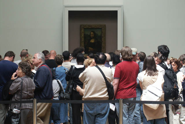 Behind the mass of camera-happy tourists is the Mona Lisa in its little glass case.
