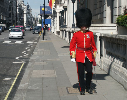 Starting at St. Paul's cathedral, I walked over the Millennium Bridge, along the Thames River and past the 'Eye' of London - the huge ferris wheel tourist attraction that takes 30 mins to do a full circle. Didn't bother to waste my money on that, but crossed the river again to Covent Gardens and checked out the street performers. I was actually expecting gardens, but no, it's just a shopping mall/market thingee. From there I headed to Leicester Square and Piccadilly Circus, got totally lost in Soho (the red-light/nightlife section of London), then headed to St. James Palace. Wandered to Trafalgar Square, then down to Downing St, home of the Prime Minister. By this time I'm dead on my feet and ready to leave, so I checked out Big Ben and the Houses of Parliament, then found the Westminster tube station and headed home.