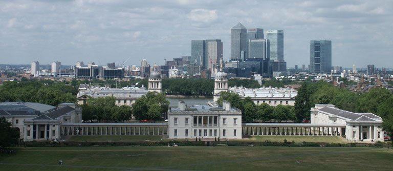 The London skyline, taken from the Royal Observatory in Greenwich. That's the Queen's House in the middle, and the Maritime Museum to the far left.