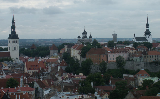 A view from the top of St. Olaf's cathedral. The Tallinn cityscape is dotted with many of these church spires rising from the streets. Note the Alexander Nevski cathedral domes.